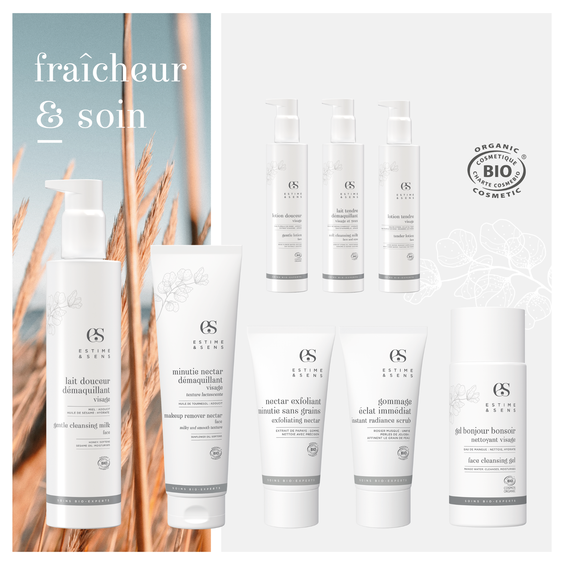 - Actifs végétaux (aloe vera, calendula, thé vert, acides de fruits doux) qui hydratent, calment les rougeurs ou favorisent l’éclat du teint.